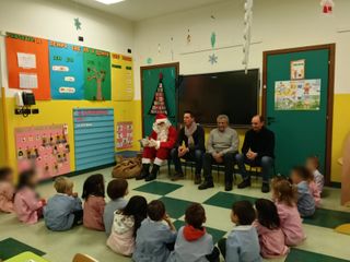 Infine, in data 18 dicembre gli alunni hanno trascorso una piacevole mattinata in compagnia di un personaggio davvero speciale: Babbo Natale!!! Accompagnato dal sindaco e dai rappresentanti dell’amministrazione comunale, Babbo Natale ha donato ad ognuno un gustoso presente. Tutti insieme si sono recati presso la casa di riposo “Alba Rosa” per uno scambio di auguri natalizi. I bambini hanno intonato allegri canti natalizi e donato agli ospiti presenti nella struttura un presepe realizzato con materiale naturale e di recupero nell’ottica del rispetto ambientale, uno dei cardini della programmazione educativo didattica annuale “Natural…mente io”.