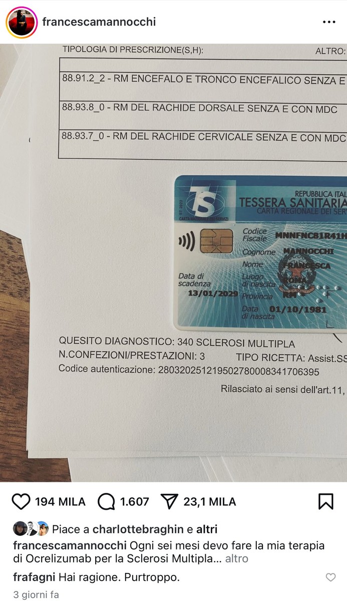 Malata di sclerosi multipla, patologia neurodegenerativa che colpisce il sistema nervoso centrale e che necessita di un monitoraggio costante, ogni sei mesi deve ripetere "una lunga serie di analisi e la risonanza magnetica per vedere l'evoluzione della malattia”, ha scritto in un post su Instagram ripreso da tutte le testate nazionali.
