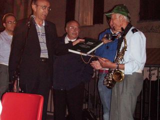 In omaggio al festeggiato: una targa ricordo e il libro dedicato alla storia del corpo bandistico cebano a testimonianza della pluriennale collaborazione del musico anche con gli amici di Ceva.