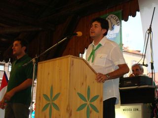 E' il momento di Calderoli. Il ministro sale sul palco in braghette e deve subito lottare con un microfono che fa le bizze: "L'unico microfono comunista lo hanno dato a me", ironizza. La folla, tra un boccone di polenta ed un sorso di vino, si scalda. E allora Calderoli attacca: "Stare al governo è difficile, stare quando c'è Berlusconi due volte di più". Aria di rottura? Macché: "Il cavaliere è sfigato. La prima volta che sta al governo vanno giù le Torri Gemelle, stavolta scoppia una crisi internazionale da paura...". E che cavoli, sfortunato davvero. Ma non di solo sfiga si tratta: il ministro delle Riforme punta il dito sul "traditore". Chi? Fini, naturalmente, "che è lì, presidente della Camera con i voti degli elettori ai quali ha voltato la faccia: ma secondo voi è uno di destra chi vuol dare il voto agli immigrati e concedere il matrimonio ai gay?". Parte l'applausone, una signora ha già le mani rosse a furia di batterle.
