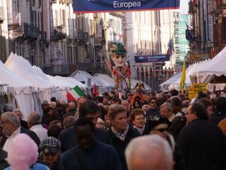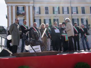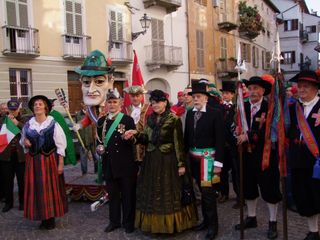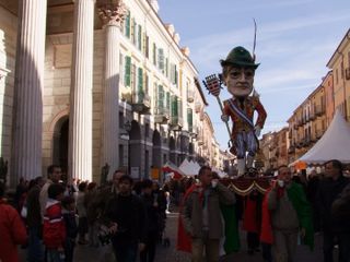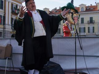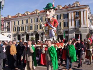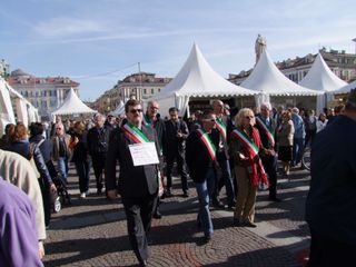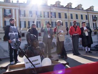 Gli UdM (vale a dire tutti coloro che, parafrasando la celebre battuta di Totò “Sono un uomo di mondo : ho fatto tre anni di militare a Cuneo “ ) si sono dati appuntamento questa mattina davanti al Teatro Toselli per il consueto ammassamento. Da qui sono partiti in corteo portando a spalle fra gli stands della Fiera del Marrone in Via Roma un'enorme sagoma di Totò costruita in cartapesta con infinita pazienza dall' UdM Salomone Sandro. Di seguito la Banda Ermanno Buccaresi, la Mula di Mondo Regina che quest'anno trasportava i due fiumi cuneesi La Stura e il Gesso allegoricamente interpretati da due ragazzi in compagnia della statua in bronzo di Totò , imprestata dal Sindaco di Alassio. Quindi una delegazione dei Sindaci di Mondo, in rappresentanza dei Comuni con meno di mille abitanti che sembrerebbero destinati a sparire, come se fosse colpa loro se le cose in Italia vanno male. Quindi l' arrivo trionfale in Piazza Galimberti dove le “Statue di mondo”, ovvero alcuni monumenti cittadini, fra i quali anche la famigerata “Supposta” (Il Grande Silenzio Bianco nella rotonda all'ingresso del Viadotto Soleri) hanno preso la parola interpretati dagli attori Mario Brusa, Oliviero Corbetta, Luca Occelli, Stefano Brusa, Andrea Beltramo, Carola Iossetti.