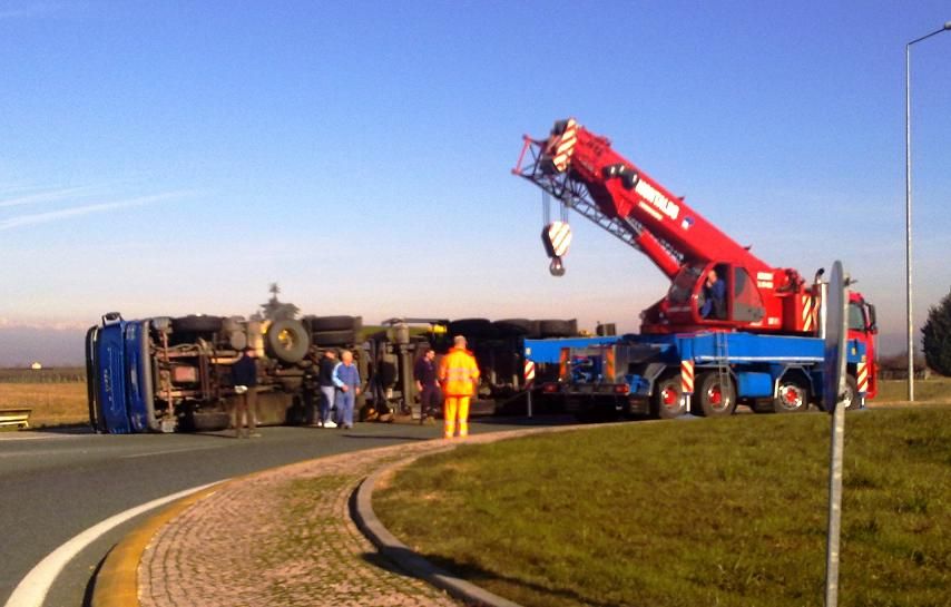 Camion si ribalta in una rotonda a Saluzzo: traffico rallentato per tutta la mattinata