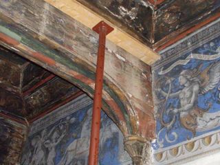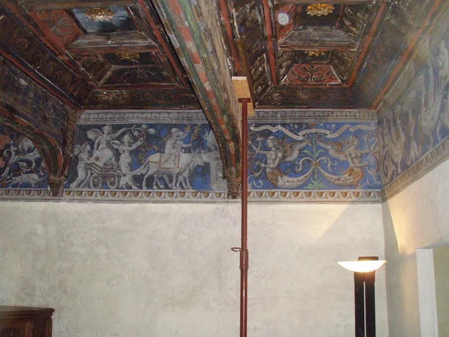 Puntellata una sezione del cassettone della sala degli Acaia, la sala XI, al primo piano di Casa Cavassa, chiamata così per la raffigurazione sul fregio delle pareti dello stemma dei Savoia Acaia ( linea collaterale della famiglia sabauda, originaria di Pinerolo).
