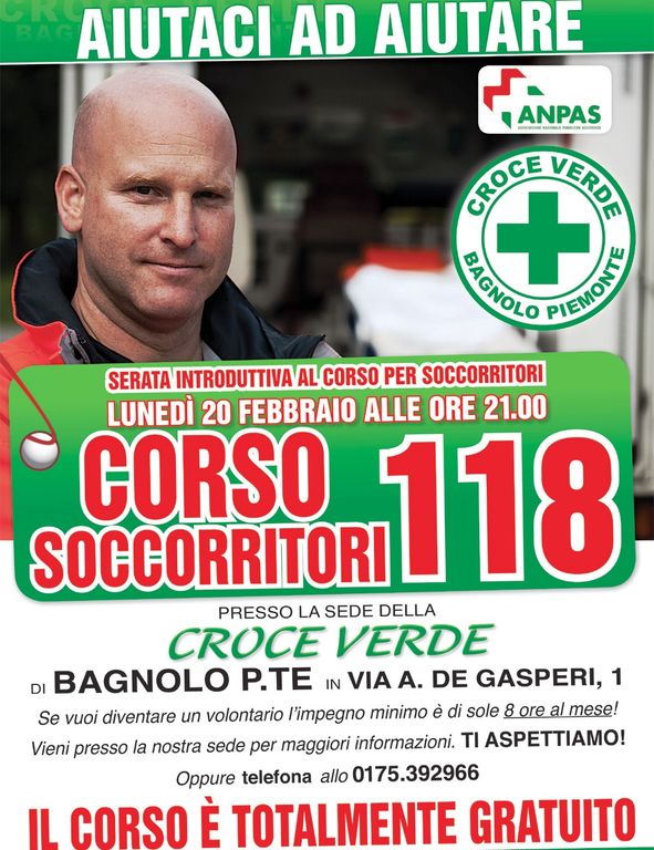 La Croce Verde Bagnolo Piemonte invita quindi a partecipare numerosi alla serata introduttiva del corso per volontari soccorritori che si terrà lunedì 20 febbraio, alle 21, a Bagnolo Piemonte presso la sede della Croce Verde in via Alcide De Gasperi, 1.