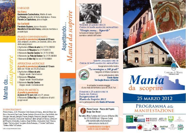 Domenica 25 marzo, a partire dalle ore 11, in occasione delle Giornate FAI di Primavera che vedranno l’apertura del castello della Manta, splendida proprietà del FAI - Fondo Ambiente Italiano, il Comune di Manta, in collaborazione con la Delegazione FAI di Cuneo, organizza una speciale occasione di visita delle bellezze e particolarità del territorio mantese, attraverso un percorso guidato arricchito da momenti di svago e divertimento. La manifestazione verrà inaugurata con un saluto dalle Autorità, alle ore 14, in piazza del Popolo.