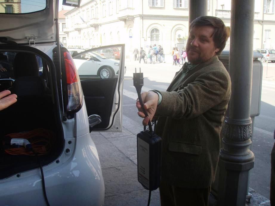 Prima di ripartire “un biberon di energia” con il cavo attaccato all’erogatore di corrente, sotto l’ala di ferro di piazza Cavour. La macchina elettrica di Luca Mercalli, era in ricarica ieri mattina davanti a palazzo Italia, dove il meteorologo ha tenuto la lezione “Come curare la febbre del pianeta”, per gli studenti delle scuole superiori, in programma nell’ambito della Settimana della Scienza.