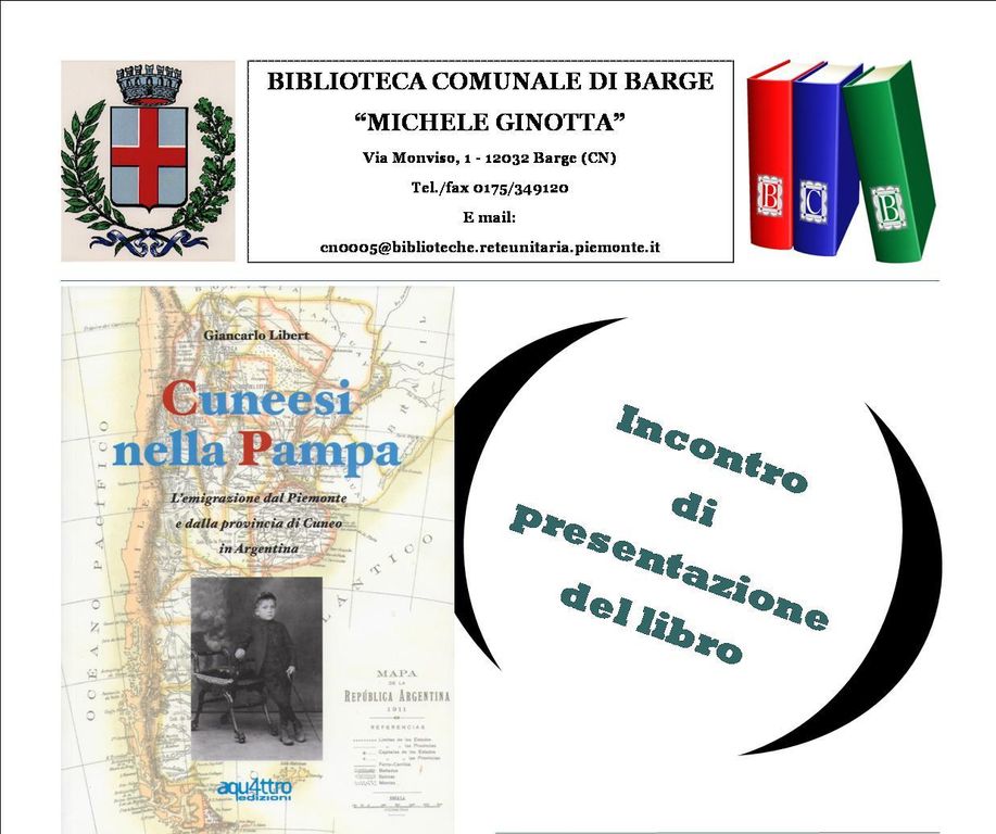 Sabato 2 giugno, alle 17.30, nel Salone "Geymonat" della Biblioteca "Ginotta" di Barge, nell'ambito delle iniziative di accoglienza del gruppo di argentini provenienti da Freyre, promosse dall' Amministrazione comunale e dal Comitato per il gemellaggio, avrà luogo la presentazione del volume "Cuneesi nella Pampa. L'emigrazione dal Piemonte e dalla provincia di Cuneo in Argentina", di Giancarlo Libert, pubblicato da Aquattro Edizioni nel novembre 2011. In questo libro, l'autore, giornalista pubblicista torinese, socio del Centro Studi Piemontesi di Torino e della Società di Studi Storici di Cuneo, che da oltre venticinque anni conduce ricerche di storia locale e di storia dell'emigrazione piemontese, esamina il fenomeno dell'emigrazione dalla provincia di Cuneo all'Argentina, facendo riferimento ai dati forniti dal Primo Censimento Generale della Popolazione Italiana, datato 31 dicembre 1861, dall'Annuario Statistico dell'Emigrazione Italiana dal 1876 al 1925, dalla relazione scritta dall'ispettore Bouchard nel 1882 sulle 68 colonie nella provincia di Santa Fe e dal Rapporto Italiani nel Mondo, elaborato sui dati AIRE (Anagrafe italiana dei residenti all'estero) aggiornati al primo gennaio 2011.