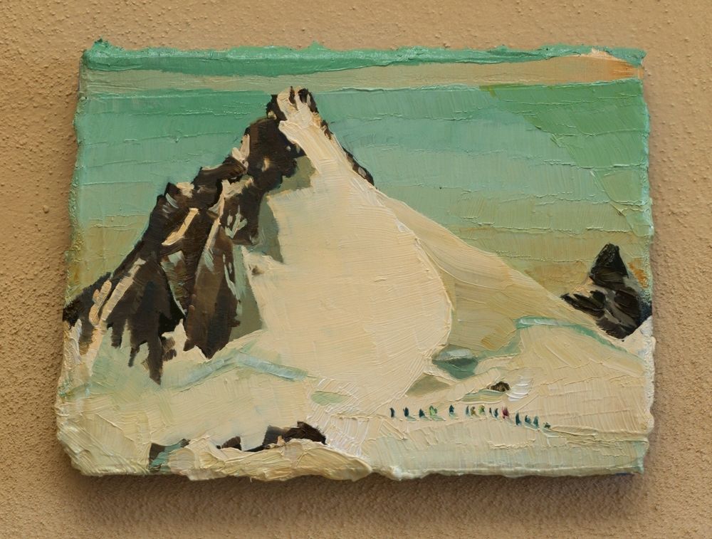 Ma analizziamo l’opera: i colori sono distribuiti senza risparmio; la parete bianca della montagna innevata è sovrastata da tonalità crescenti di verde; in basso a destra (forse sono costoro a suggellare il significato del titolo, con la loro ascesa) un gruppo di persone (stimabile in 14 – 16) è reso mirabilmente nonostante vi sia in realtà solo un abbozzo per ciascuna figura. Anche le ombre sono rese, nella loro essenzialita’, in modo chiaro e netto. L’interpretazione di alpinisti in ascesa è fuori discussione. E’ ininfluente, poi, stabilire se il gruppo reca nella parte finale una slitta (come parrebbe, data l’altezza limitata dell’elemento che chiude la fila) o se vi sono zaini per ciascun membro del gruppo. Il capo-cordata pare infatti non gravato da ingombri sulle spalle. L’opera è compatta e dal formato irregolare. La pittura assolutamente materica rafforza la potenza del manto nevoso e sembra quasi solcata, all’estremità bassa, a destra, dal passaggio della comitiva. Senza dubbio evocativo, il titolo: piccoli passi, ma sicuri; per una meta imponente che campeggia sovrana e che occupa gran parte della superficie dell’opera.
