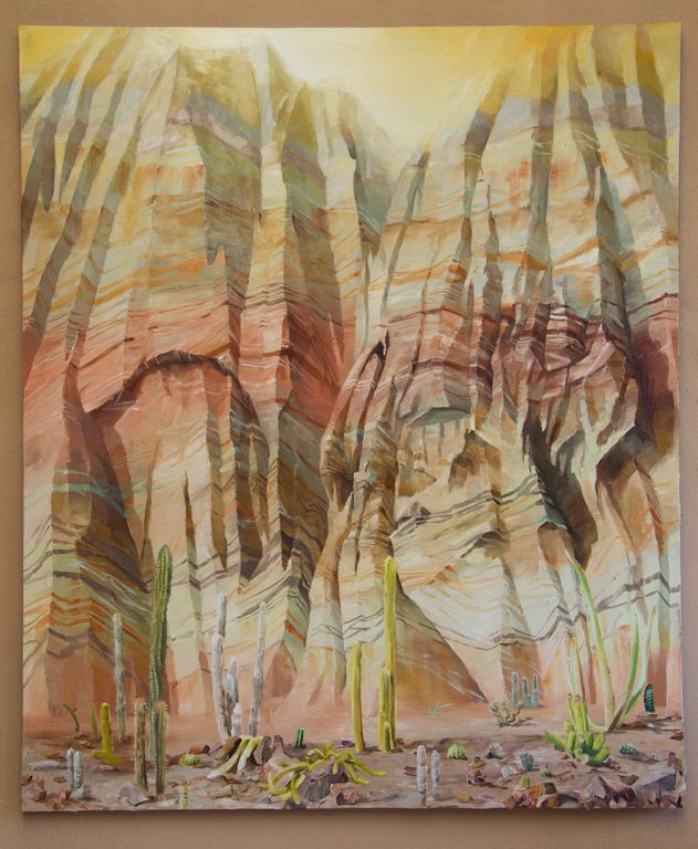 Altra situazione nel lavoro che ha per titolo “Big Wall”: terre aride e pareti che senza dubbio ricalcano il concetto di maestosità. Striature orizzontali marcate (sono una caratteristica che si ritrova spesso nei lavori del pittore nativo di Boulder, Colorado) e vegetazione tipica di zone aride. Di certo qui l’artista non ha tratto ispirazione dalle vicine Alpi che da Monchiero Alto sono ben visibili. Due note sulle luci: all’altezza della desolata vegetazione un richiamo ad una luminosità intensa, forse a determinare la potenza del sole che non perdona. Come se non bastasse, la parte alta è un tripudio di raggi che di fatto creano mistero circa la effettiva altezza della grande parete richiamata dal titolo. Non poteva fare di meglio, Christopher, per esaltare la rilevanza dei due elementi: roccia e sole, ovvero entita’ terrena e luce immane che da’ vita ma che puo’ arrivare a negarla se l’ambiente e’ ostile.
