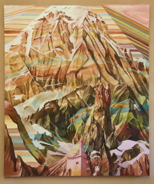 Infine “High Baroque”: forse la vera sintesi tra i due precedenti lavori. Le pareti rocciose svelano, se attentamente osservate, una mirabile commistione di elementi del paesaggio citato per “Big Wall” ma regalano una neve tardo-primaverile che la vista percepisce (forse inconsciamente, in virtù del modello “Colorado” proposto in precedenza) come rimasuglio su pareti “bollenti”. Si badi poi che la montagna assume, in alto, a destra e a sinistra, connotati formali, percepibili come nessi architettonici ben chiari. E poi, magia votiva, centrale, in basso; e’ su questa improbabile chiesa (ma di certo pensata dal Russell come sfida religiosa all’imponenza della natura) che si fonda la riuscita visione sacra che a poco a poco prende forma nell’artista e che le pagine del suo blog personale (http://purplepanniers.tumblr.com/ ) richiamano con una certa insistenza. A tal punto che l’edificio religioso rappresentato nell’opera lo si ritrova fotografato li’. Basta scorrere le foto (varie per genere) dall’alto verso il basso e, ad una certa altezza, contrassegnata dalla didascalia “Looking out the window”, eccolo!.