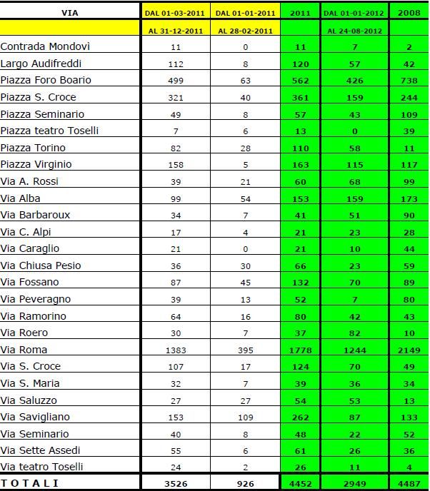 Oggi arriva la risposta del Comando di Polizia Locale di Cuneo, nella persona della dottoressa Stefania Bosio, che si limita a far notare quanto i controlli in zona, dal suo arrivo, si siano intensificati, e con essi anche il numero di contravvenzioni. Che riguardano un po' tutti i tipi d'infrazione: dai divieti per soste di varia natura, ma anche ZTL e violazione di norme di comportamento. Il tutto lo si può evincere dalla tabella che pubblichiamo a margine dell'articolo.