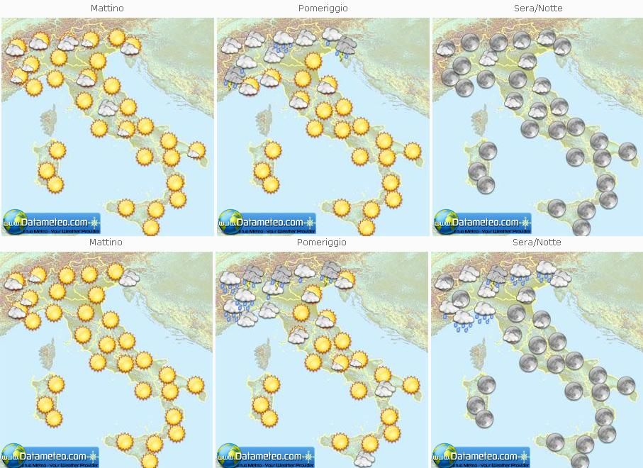 Previsioni di giovedì 30 agosto: Nuvolosità in progressiva intensificazione su tutte le regioni. Tra la tarda mattinata ed il primo pomeriggio inizio dell'attività temporalesca su Alpi, Prealpi. Estensione della stessa al Piemonte, alla Lombardia, fino a raggiungere la Liguria nella notte.