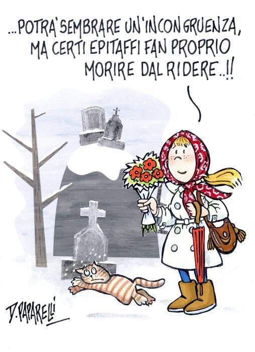 Il tema dei cimiteri, con annessi e connessi, è stato anche oggetto di alcuni libri di amici umoristi- scrittori. Come il “Colpito in fronte da nemica palla” di Bruno Gambarotta, nel quale vengono trascritte le frasi, involontariamente comiche, che sono state scolpite nelle lapidi, -e già il titolo del libro ne è un chiaro esempio. E “NECROlogica”, il libro “lapidario” dell'attore satirico Alberto Patrucco, di pura fantasia, con epitaffi di personaggi famosi o famigerati ancora in vita, così che possano leggere, si spera con largo anticipo sui tempi, come potrebbe essere ricordato nei secoli. Un modo come un l'altro per sfatare scaramanticamente il momento del trapasso.