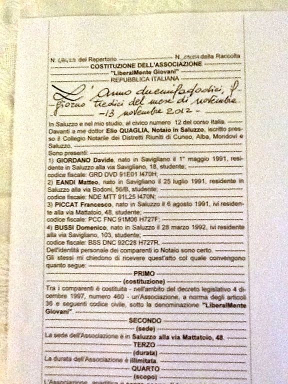 Martedí 13 novembre alle ore 19.00 nell'ufficio del notaio Elio Quaglia di Saluzzo, è stata costituita l'Associazione "LiberalMente Giovani". Apartitica e senza scopo di lucro, si ispira ai valori del liberalismo, dell'europeismo e della libertà individuale, "LiberalMente Giovani" si propone di contribuire, attraverso la sensibilizzazione dei cittadini ed in particolare dei giovani alla diffusione di tali valori.