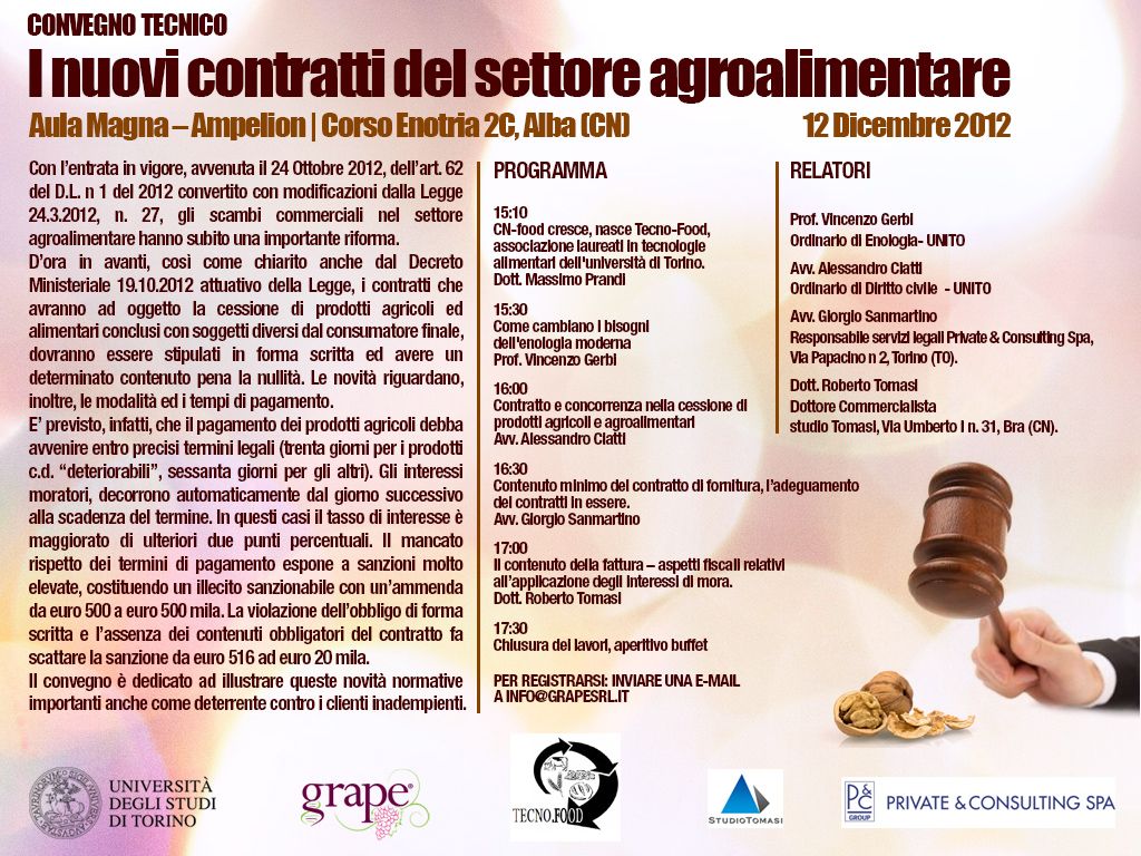 L’Associazione Tecno.Food, in collaborazione con l’Università di Torino, Grape srl, Studio Tomasi e Private & Consulting SPA, promuove il convegno tecnico “I nuovi contratti del settore agroalimentare”, che si terrà ad Alba, il 12 dicembre alle ore 14.45 presso l’Aula Magna della sede dell’Università di Torino (Ampelion, Corso Enotria 2c, Alba).