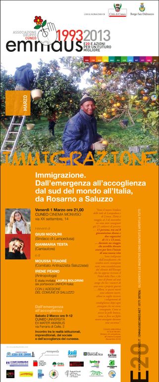 Saranno incentrati sulla tematica dell’immigrazione i prossimi eventi delle iniziative organizzate nell’ambito dei venti anni dell’Associazione Emmaus Cuneo in collaborazione con varie associazioni, sindacati ed i comuni di Cuneo e Borgo San Dalmazzo venerdì 1 e sabato 2 marzo a Cuneo.