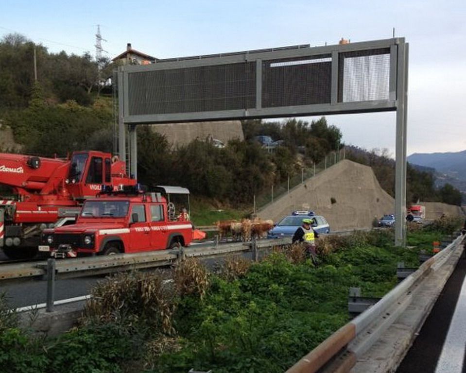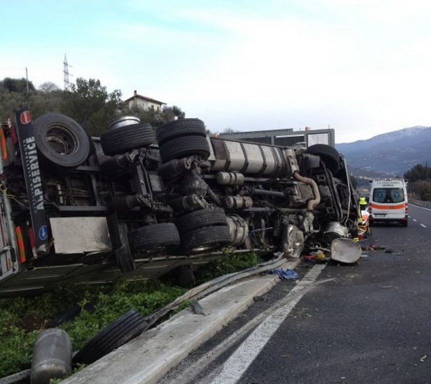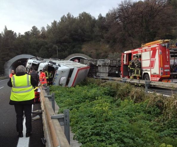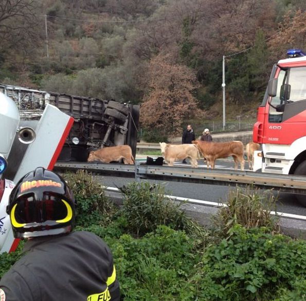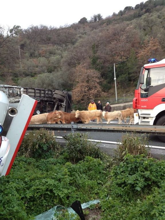 Camion di ditta cuneese si ribalta in autostrada tra Imperia Est e Ovest: vitelli in strada, caos e panico