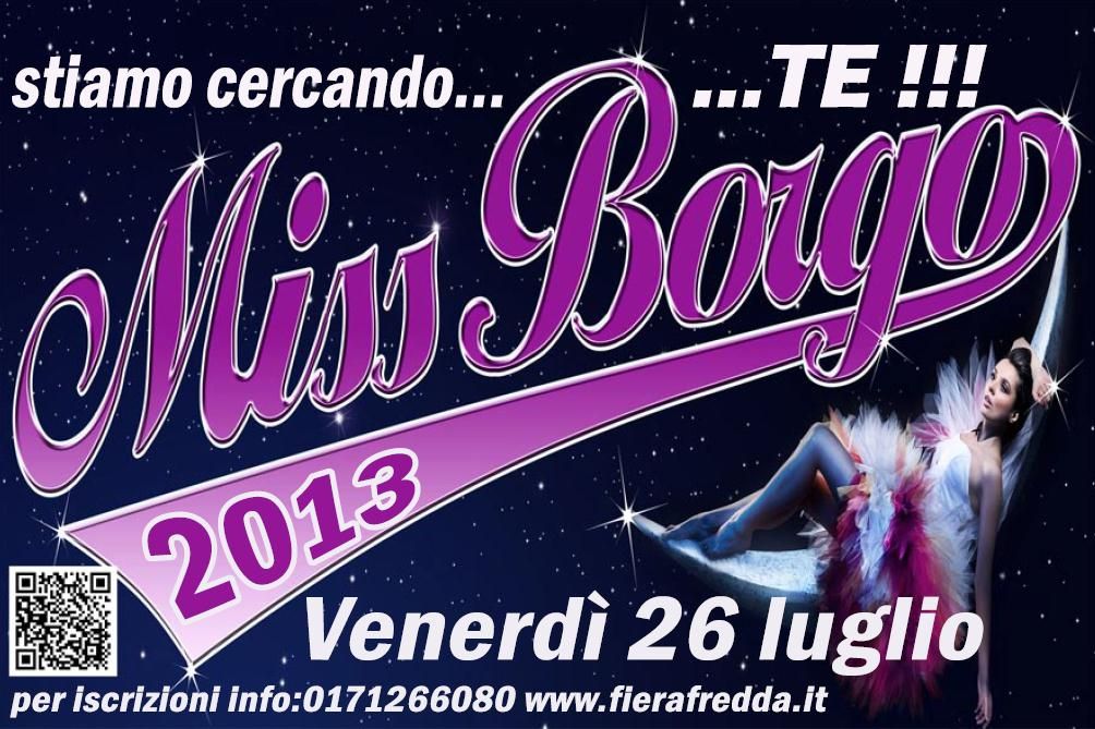 Miss Borgo 2013 evento organizzato dall’ABC Doc (Associazione Borgo Commercianti) in collaborazione con il Comune di Borgo San Dalmazzo e l’Ente Fiera Fredda nell’ambito delle manifestazioni estive si svolgerà venerdì 26 luglio.