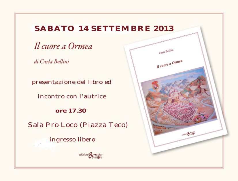 Sabato 14 settembre alle ore 17.30 presso la Sala Pro Loco (Piazza Teco) ad Ormea) si svolgerà la presentazione del libro “Il cuore a Ormea” di Carla Bollini (Ed. ColoreMore – www.coloremore.it) - ingresso libero.