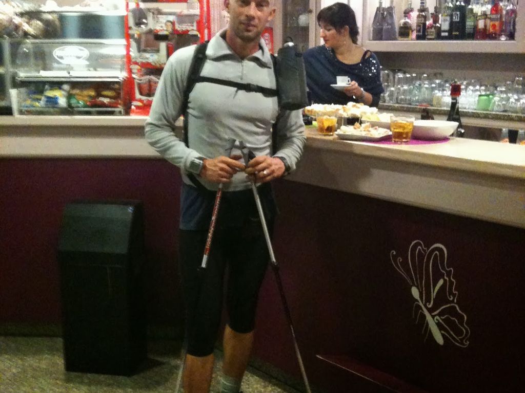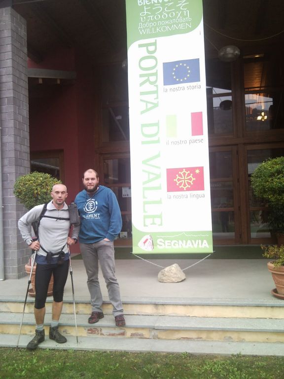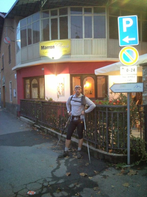 “Alla partenza sono passato a salutare Daria la titolare del Bar Butterfly di Revello, quindi un passaggio obbligato dalla Palestra Tempio del Fitness e così prima dell'alba, alle 6.20 di sabato 2 novembre 2013 è iniziato tutto! Prima delle sette sono giunto a Rifreddo dagli amici del Bar Los Amigos per una nuova foto a prova del passaggio. Pochi minuti prima dei timidi raggi di luce è stata la volta del Marron Glacé di Sanfront. Quindi l'inizio della lunga salita che mi avrebbe portato oltre San Bernardo di Pasturel, arrivando fino in cima al Col del Prete ai 1700 metri sopra il livello del mare.