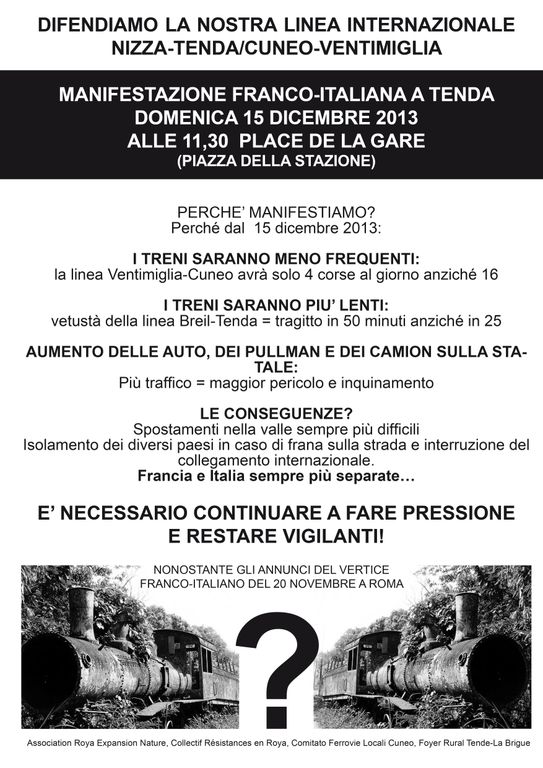 Domenica 15 Dicembre il Comitato partecipa e invita tutti alla manifestazione internazionale di Tenda contro la chiusura della Cuneo-Nizza. Ritrovo ore 9,15 alla Stazione di Cuneo. Partenza in macchina ore 9,30. (le corse in treno rimaste sono improponibili: partenza da Cuneo alle 7,51 e ritorno a Cuneo alle 21,18!!)