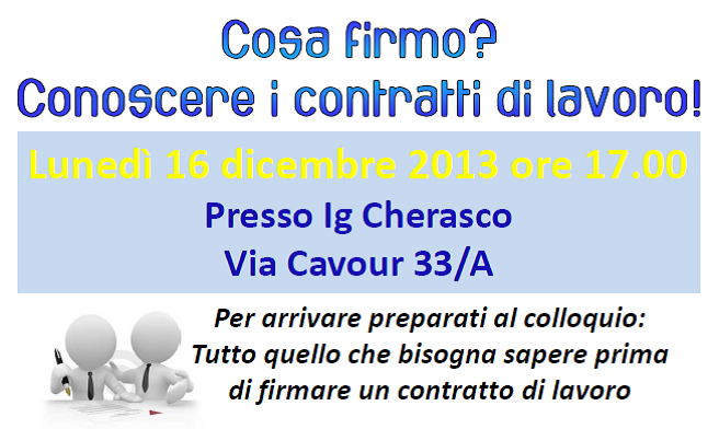 Lunedì 16 dicembre 2013 alle ore 17 si terrà presso lo sportello del servizio comunale InformaGiovani di Cherasco, sito in Via Cavour 33/A, un incontro informativo ad ingresso libero rivolto a tutti gli interessati alla tematica del lavoro.