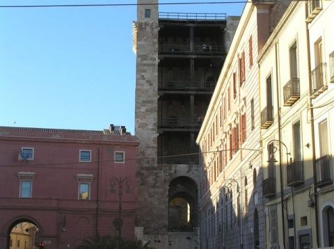 Torre difensiva, progettata dall'architetto cagliaritano Giovanni Capula ed eretta dai pisani nel 1305. Posta ad un centinaio di metri sopra il livello del mare, sviluppata su quattro livelli per un’altezza complessiva superiore ai trentasei metri, essa era un perfetto posto di avvistamento contro eventuali attacchi provenienti sia dal mare che dall’entroterra. Persa l’originaria funzione di principale accesso al Castello, nel XVI secolo la torre fu adibita a carcere, dove i galeotti vivevano in condizioni disumane. Sebbene oramai pressoché avulsa dalla piazza Indipendenza, la Torre di San Pancrazio è ancora una delle figure maggiormente riconoscibili nel profilo della città di Cagliari.