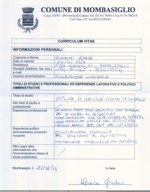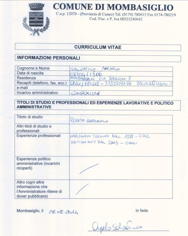 Ve ne è pure uno “non allineato”, che non si conforma ai restanti cìnque recanti in alto a sinistra lo stemma araldico del Comune. Appartiene a Laura Sclavo ed è l'unico compilato su due pagine. E' anche l'unico che non risulta essere datato e firmato. Tutti gli altri, visibili partendo dalla pagina www.comune.mombasiglio.cn.it/Amministrazione/Consiglio/tabid/10101/Default.aspx