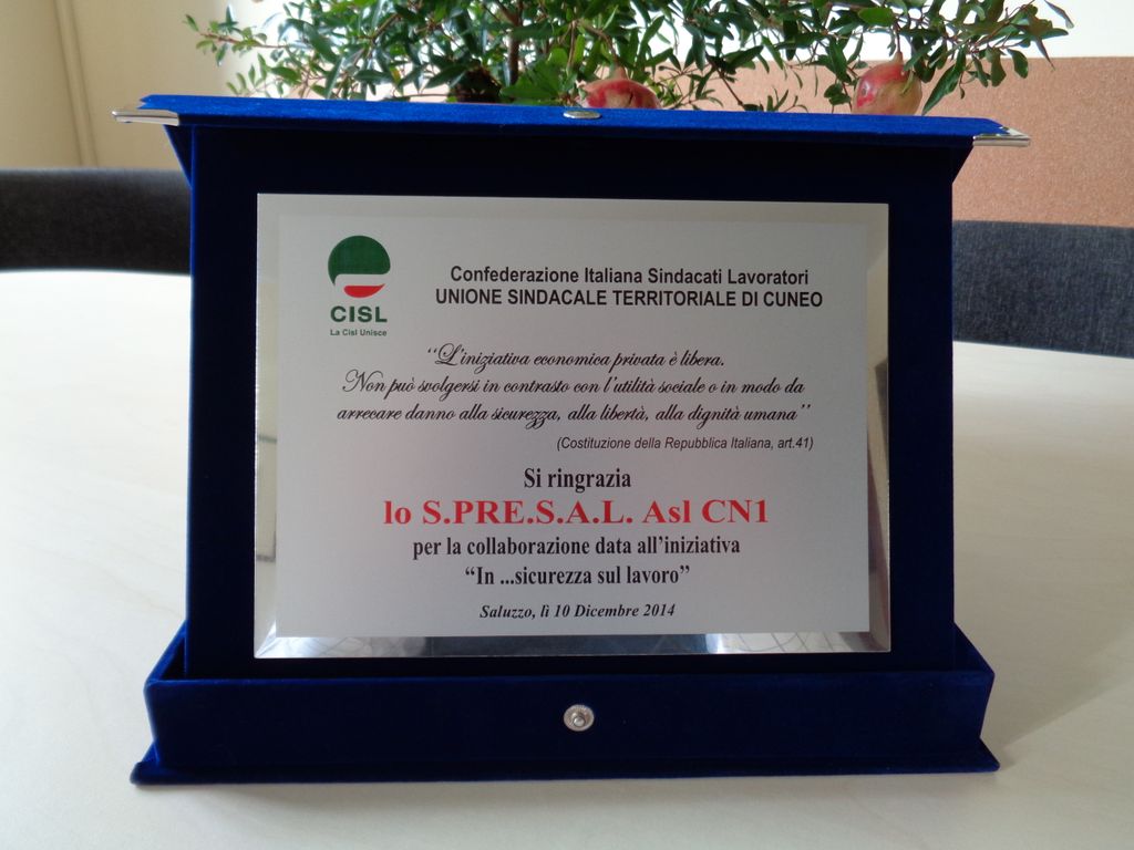 In occasione della giornata di premiazione, organizzata dalla CISL provinciale, degli studenti degli istituti scolastici che hanno partecipato all'iniziativa "In.... Sicurezza sul Lavoro" è stato consegnato un riconoscimento da parte degli organizzatori allo S.Pre.S.A.L. dell’Asl CN1, per ringraziare per il contributo fornito a questa e ad altre manifestazioni che organizzano sul territorio.