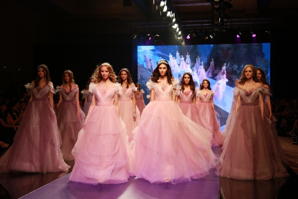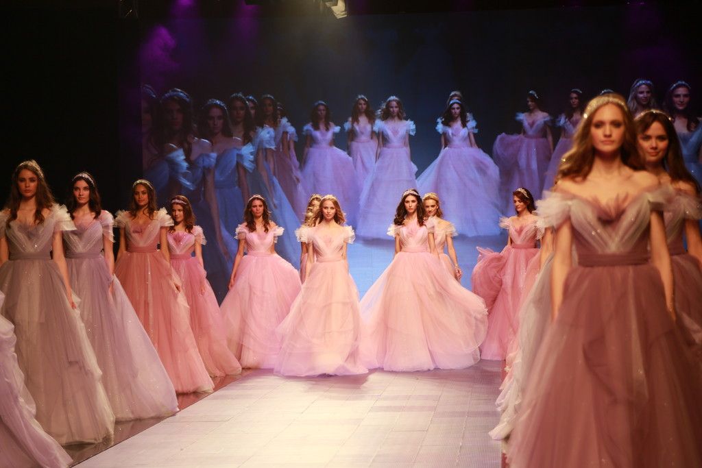 Il gran finale sulla passerella illuminata a led e la sala immersa nell’emozione di musica e luci, con un quadro di insieme da sogno: 20 modelle con lo stesso vaporoso modello di abito in tulle brillante, sviluppato in quattro nuances dal rosa al viola.