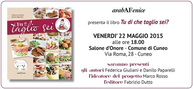 Domani venerdì 22 maggio presso il Salone d'onore del Comune di Cuneo alle ore 18 la food blogger Federica Gelso Giuliani, il vignettista Danilo Paparelli e il direttore di "Terraviva" Marco Rosso con l'editore Fabrizio Dutto presenteranno il nuovo volume edito da Araba Fenice "Tu di chetaglio sei", 31 ricette realizzate e fotografate da Federica e illustrate con le divertenti vignette di Paparelli per scegliere e cucinare il taglio giusto della carne di razza bovina piemontese.