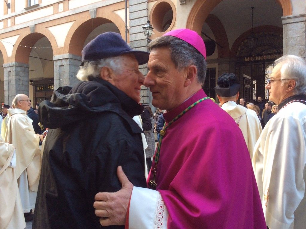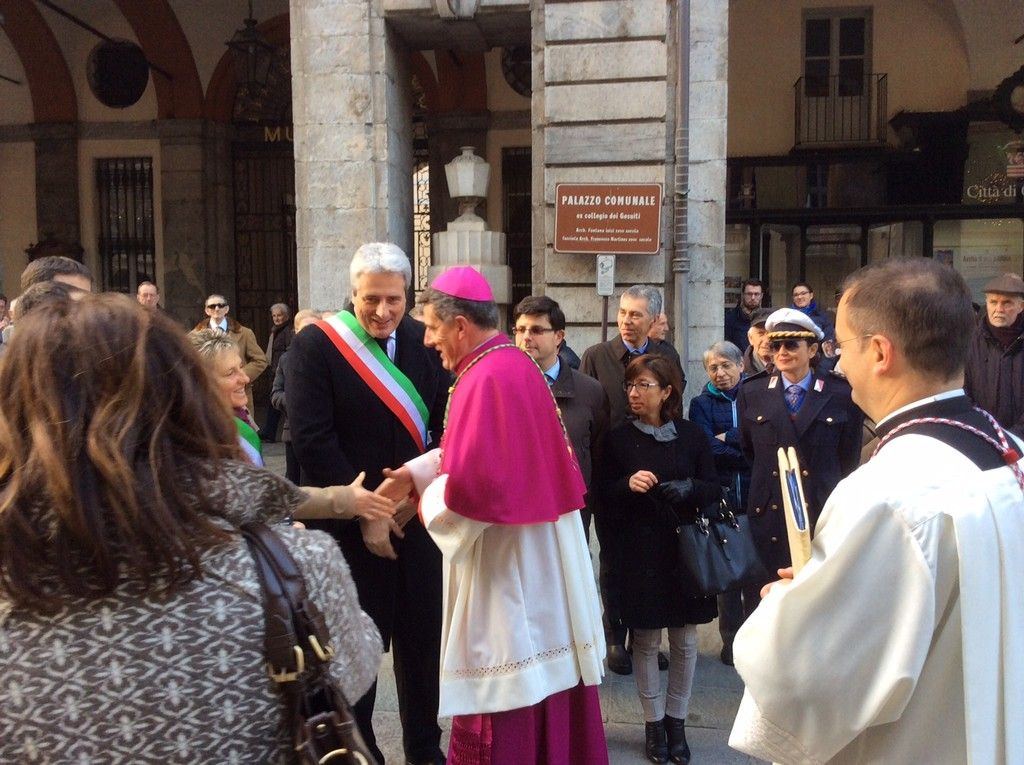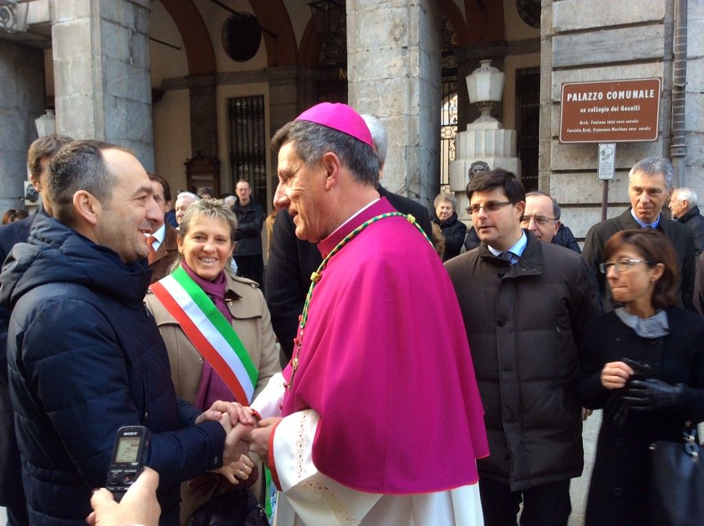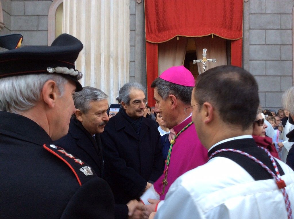 Monsignor Delbosco si è fermato a salutare tutti, stringendo mani e abbracciando vecchi conoscenti. Con l'accompagnamento della banda, la processione è giunta prima di fronte al Municipio, dove ad attendere il neovescovo c'era il sindaco assieme a diversi membri della Giunta, e poi al Duomo, dove erano presenti il Prefetto, il Questore, il comandante dell'Arma provinciale, quello della Forestale e tantissime autorità, oltre che molti sindaci della zona.