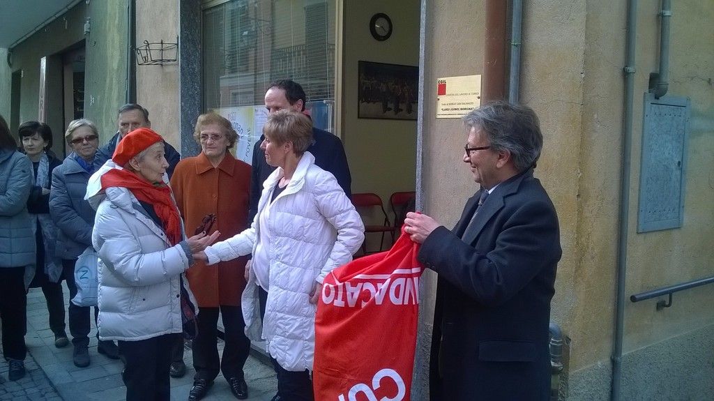 La piccola sede si è ritrovata semplicemente strapiena, oggi, e tra le varie persone e personalità presenti c'erano anche Ughetta Biancotto dell'ANPI e Davide Masera della CGIL, oltre ovviamente (in rappresentanza della famiglia) a Laura Borgna, figlia di Gino. Commossa ed emozionata, ma allo stesso tempo orgogliosa, l'atmosfera, specialmente nel momento in cui la targa d'intitolazione è stata scoperta dal drappo rosso della CGIL che la ricopriva e quando la Biancotto ha ricordato che "se Borgo è Medaglia d'Oro al Merito Civile per i fatti relativi all'occupazione tedesca, è anche in parte merito di Gino".