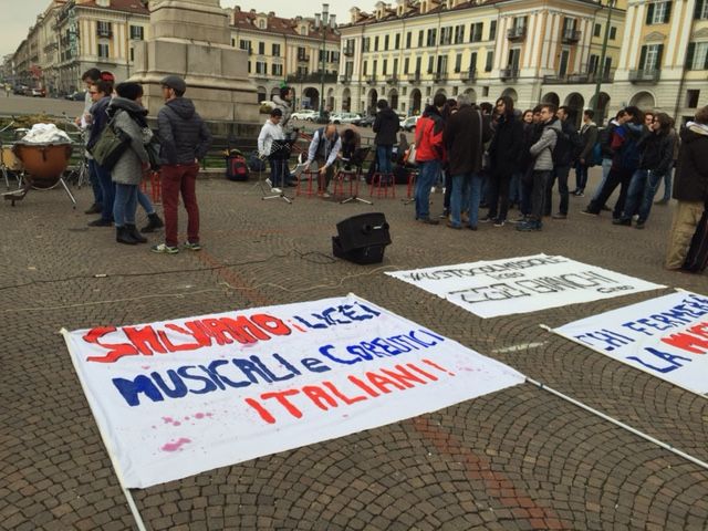 Gli studenti del liceo artistico musicale Ego Bianchi di Cuneo sono scesi nella piazza principale del capoluogo questa mattina, mercoledì 23 marzo, per manifestare contro la riforma decisa dal Governo che prevede, a partire da settembre la sostituzione totale dei professori di indirizzo.