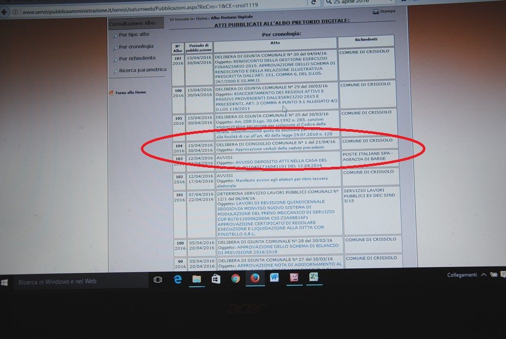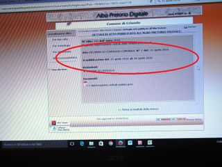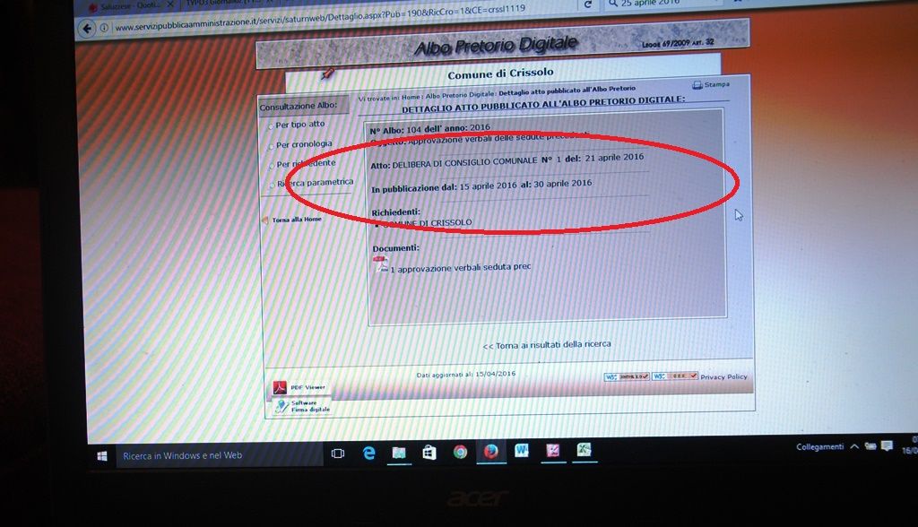 Una delibera (quella cerchiata di rosso nell’immagine) che se ci si fermasse alle date di inizio e fine pubblicazione, è verosimile ipotizzare sia esposta all’albo pretorio online addirittura da ieri, venerdì 15 aprile.