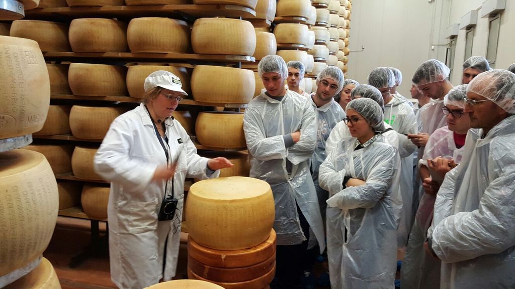 Nello specifico gli allievi hanno potuto seguire la produzione e la stagionatura del Parmigiano Reggiano seguendo la filiera del prodotto dal latte (visite guidate in azienda) sino al taglio ed alla degustazione del formaggio al banco.