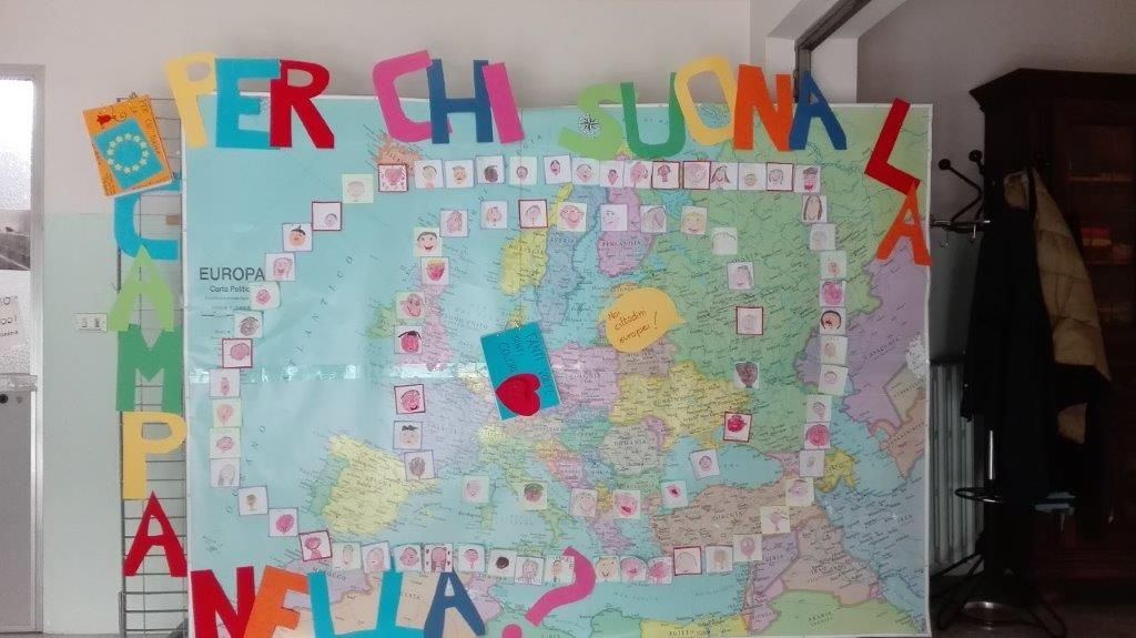Ogni bambino ha disegnato il proprio volto che è poi stato attaccato su una cartina dell'Europa, formato gigante!La mattinata si è conclusa con lo scambio di alcuni “doni”: una coccarda per i bambini dell'Infanzia, che fungerà da “passpartout” a settembre, e un segnalibro per i bimbi della Primaria.