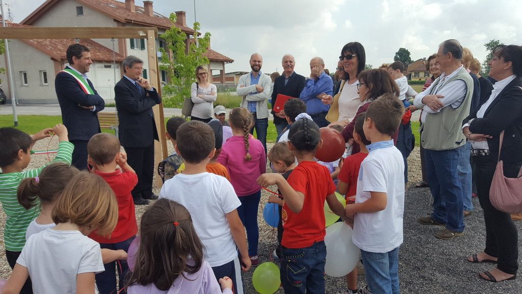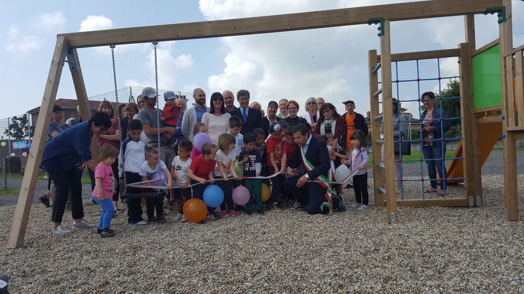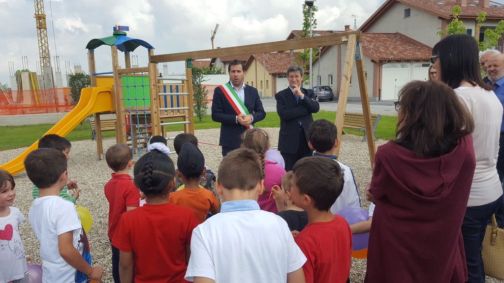 Dopo la benedizione è stato tagliato il nastro dal sindaco Davide Sordella, affiancato dal vice sindaco Vincenzo Paglialonga e dai bambini della scuola materna “Un nastro è un po’ come la carta di un regalo. Il regalo già c’è ma non si può ancora usare. Da oggi potrete usare questa attrezzatura, ma abbiatene rispetto e vigilate sui più grandi perché lo rispettino a loro volta” ha spiegato il sindaco ai bambini.