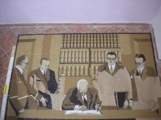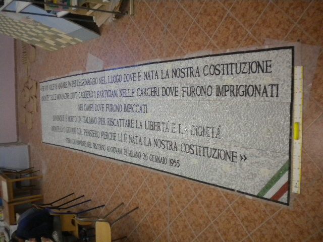 Si tratta di due opere molto importanti e significative da ricordare: la prima raffigurante la fotografia della firma della Costituzione italiana ad opera di alcuni importanti padri fondatori (Enrico De Nicola, Alcide De Gasperi, Enrico De Nicola), composta da 30.000 tesserine comprese in un mosaico delle dimensioni di 207 cm per 140 e la seconda è una riproduzione della bellissima e significativa frase pronunciata da Pietro Calamandrei nel discorso fatto ai giovani alla Società Umanitaria di Milano il 26 gennaio 1955, composta da ben 80.000 tesserine di mosaico!! La frase: "Se voi volete andare in pellegrinaggio nel luogo dove è nata la nostra Costituzione, andate nelle montagne dove caddero i partigiani, nelle carceri dove furono imprigionati, nei campi dove furono impiccati. Dovunque è morto un italiano per riscattare la libertà e la dignità, andate lì, o giovani, col pensiero, perché lì è nata la nostra Costituzione".