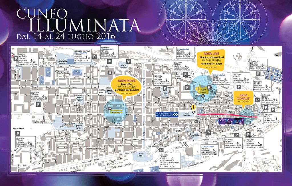 Manca poco meno di un mese all’Illuminata 2016. A partire da giovedì 14 luglio e fino a domenica 24 luglio Cuneo sarà teatro di spettacoli, musica, danza, iniziative di svago, appuntamenti gastronomici e sportivi, momenti culturali e di fede. Tre le location: Area Move in piazza Europa, Area Live in piazza Foro Boario e Area Corale in via Roma (davanti al sagrato della chiesa di Sant’Ambrogio). E poi i protagonisti indiscussi: gli spettacoli di luce a tempo di musica, in programma tutte le sere in via Roma alle 22.30 e alle 23.15.