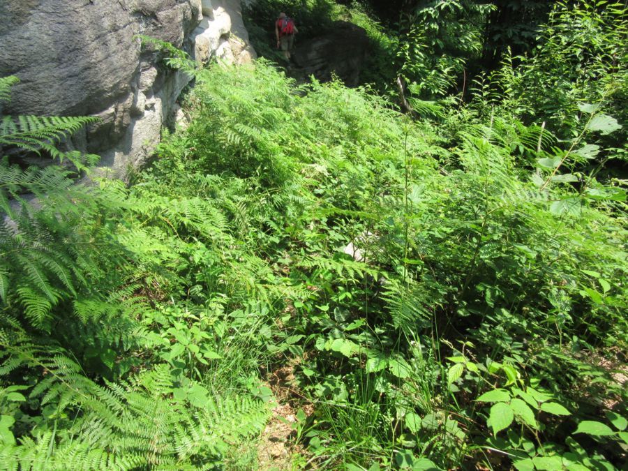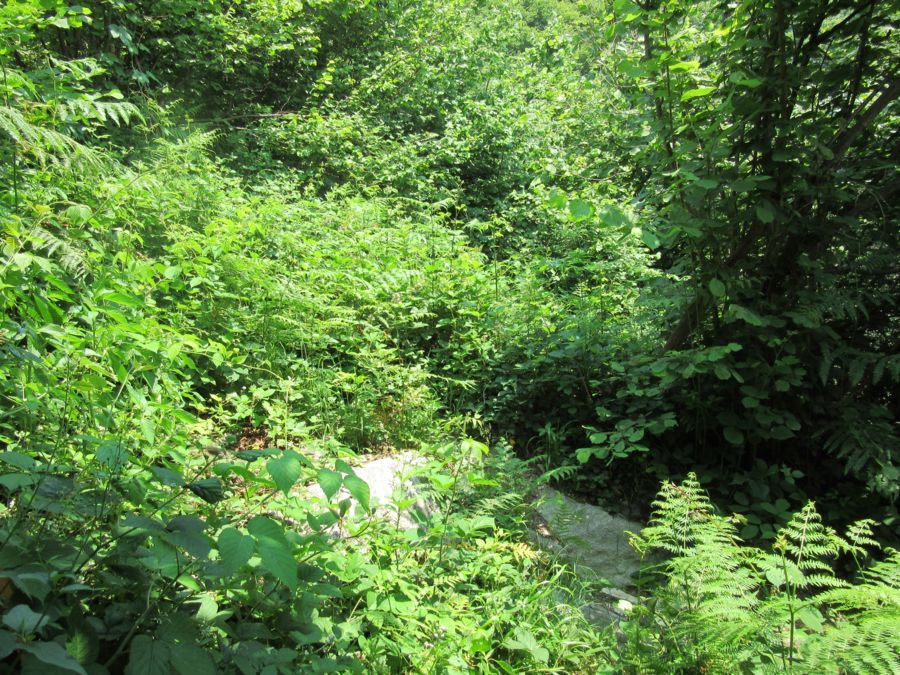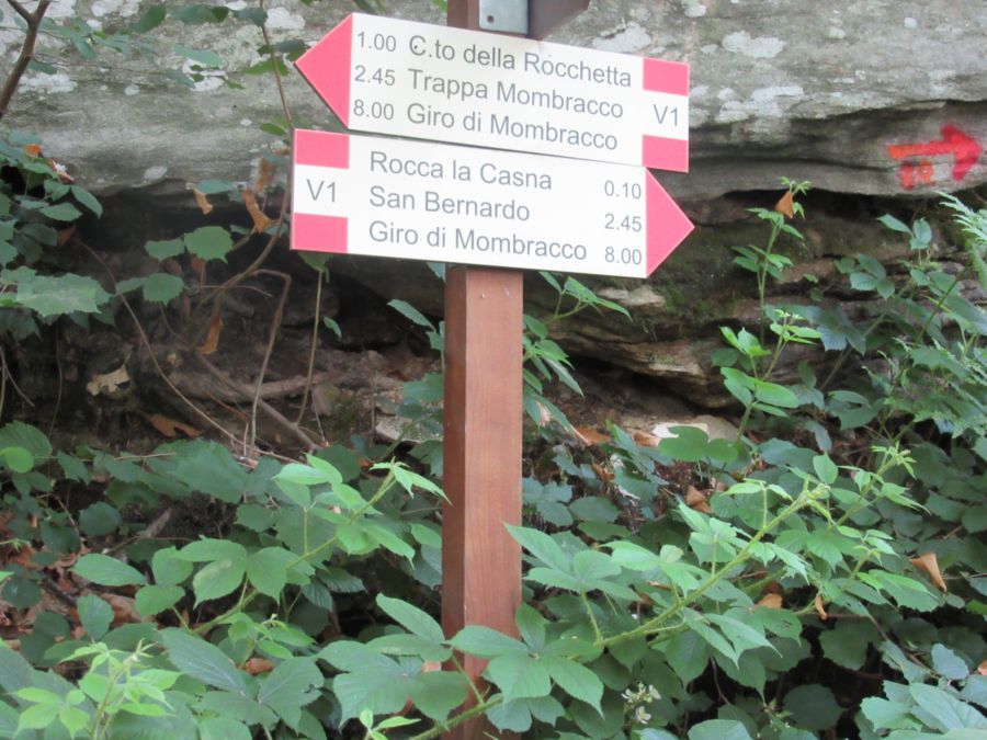 Giunti all’affasciante Convento, una brevissima visita e poi si riparte, alla volta del Colletto di Sanfront, seguendo le indicazioni fornite dai copiosissimi cartelli appositi per la sentieristica. Una volta inoltratici nei boschi sottostanti il Convento, dopo poco si incontrano le prime spiacevoli sorprese: i tanto decantati “Sentieri di Leonardo” sono stati letteralmente inghiottiti dai rovi, inestricabili ed alti da raggiungere, in certi punti, quasi l’altezza dei cartelli delle indicazioni! Il tutto è testimoniato dalle numerose foto scattate, tengo a sottolineare tutte sul sentiero, anche se non lo si direbbe e che allego alla presente.