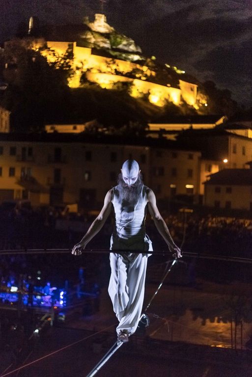 Un cammino, una storia, è la porzione di vita contenuta tra l'inizio e l'obiettivo finale. La fune rappresenta in modo semplice e universale tutte le storie. Perché le emozioni che il funambolo prova durante la traversata sono quelle primarie (paura, eccitazione, ribellione, sconfitta, vittoria, felicità) che quotidianamente fanno parte della crescita di un individuo. Tutto viene espresso attraverso una coreografia precisa che culmina nell'atto più assurdo e coraggioso, colpire con determinazione l'oggetto stesso del proprio sostentamento, il cavo, trasformandolo in qualcosa di nuovo. Seguire questa storia ascoltando il suono che produce, allineare le proprie vibrazioni a quelle del funambolo attraverso le onde musicali permette di compiere una profonda esperienza di immedesimazione e sublimazione che raccoglie pubblico ed artisti in un rito collettivo di catarsi e meraviglia.