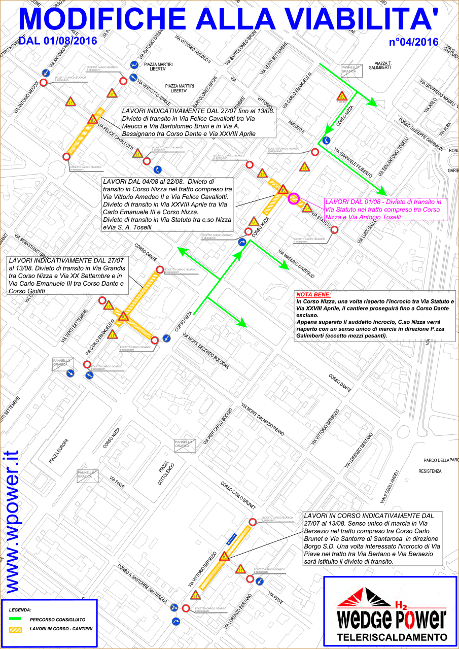In corso Nizza, una volta riaperto l'incrocio tra via Statuto e via XXVIII Aprile, il cantiere proseguirà fino a corso Dante escluso. Appena superato l'incrocio, corso Nizza verrà riaperto con un senso unico di marcia in direzione piazza Galimberti (eccetto mezzi pesanti).