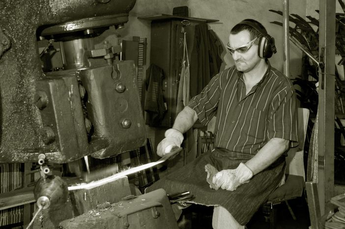 Ognuno di loro sembra perfettamente adeguato al ruolo: la solidità fisica e meditata per chi con il grosso maglio, modella il pezzo di acciaio rovente, lo sgrossa, scarta l’eccedenza, dà il via alla creazione di una lama piuttosto di un’altra; la corporatura più agile di quello che sotto il picchiare di piccoli magli riesce a creare sulle lame puntinature precise che creano il nerbo della falce, disegnando decori che ricordano i segni tribali dei Maori, quasi un augurio di buon lavoro e di messi abbondanti per il contadino che le userà. Il nostro percorso fotografico all’interno dello stabilimento Falci prosegue con l’emozione sorpresa di chi si accosta ad un mondo che sembra lontano anni luce dal mondo del lavoro attuale: qui mani, cervello e passione sono essenziali, ognuno sviluppa un grado altissimo di competenza artigianale anche se il progresso tecnico ha apportato tante migliorie.
