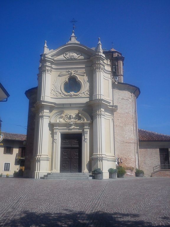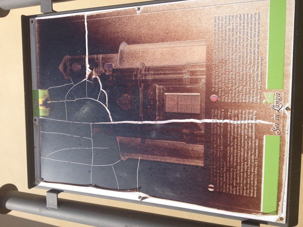 In basso la scritta “Sei in Langa”. In alto lo stemma araldico del Comune di Barbaresco. Poco sotto, a destra, l'orologio del campanile mostra (seppure alcuni in modo parziale) sette numeri su 12. In qualche misura la visione è inaspettata per chi guarda da lontano.