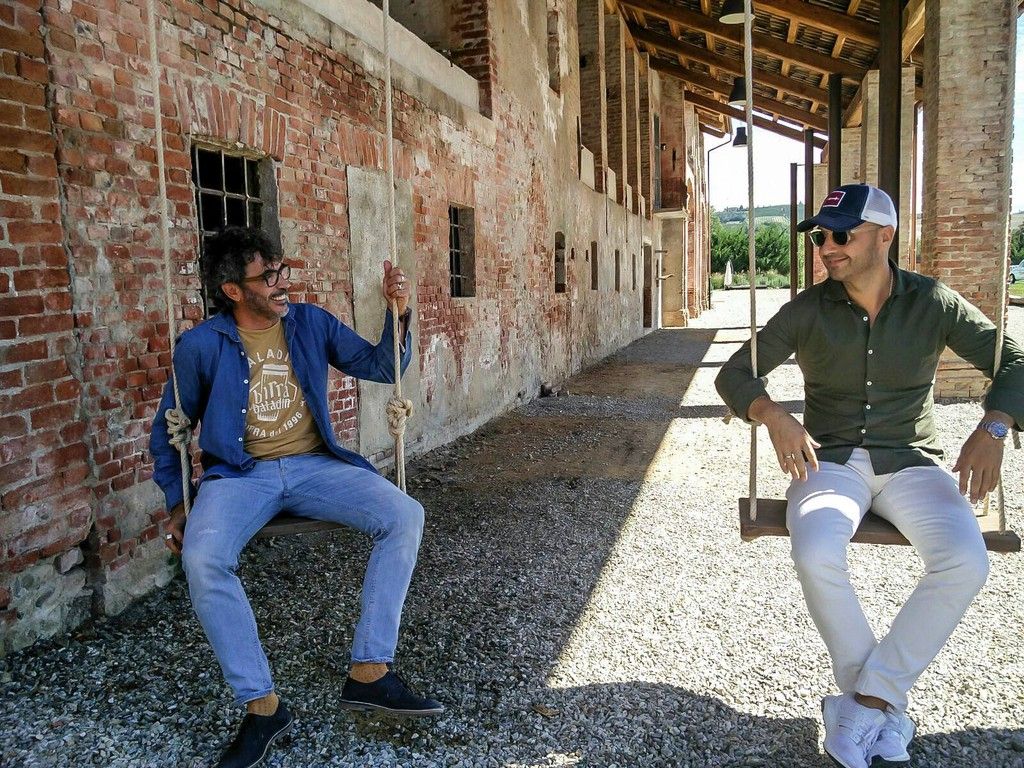 Si guardano sornioni mentre mentre dondolano su due altalene del Baladin Open Garden di Piozzo. Cosa avranno in mente Teo Musso e Joe Bastianich?