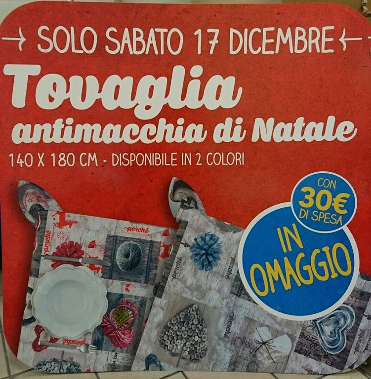 Da Eurospin è in arrivo un nuovo omaggio con acquisto. Solo sabato 17 dicembre 2016, effettuando almeno 30 euro di spesa riceverai subito in omaggio una tovaglia antimacchia di Natale.