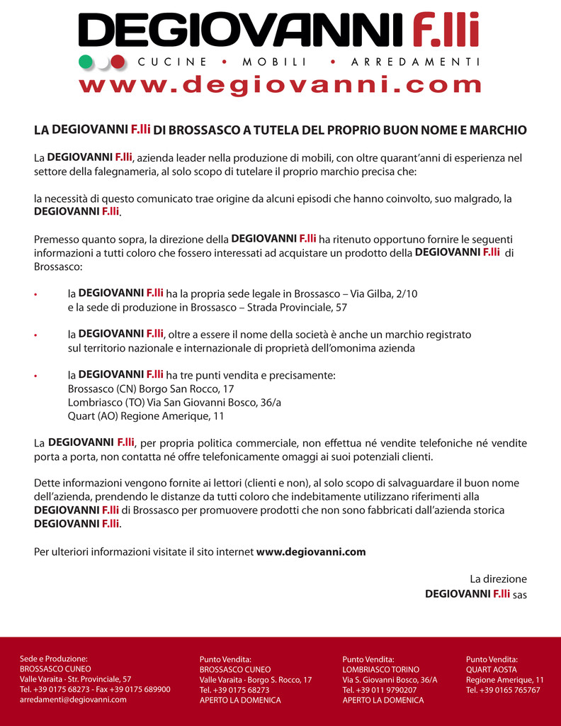 La DEGIOVANNI F.lli, azienda leader nella produzione di mobili, con oltre quarant’anni di esperienza nel settore della falegnameria, al solo scopo di tutelare il proprio marchio precisa che: