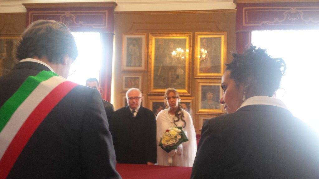 Rito civile tra parenti e amici, con testimoni della stessa nazionalità della sposa e traduzione in francese delle formule del rito.