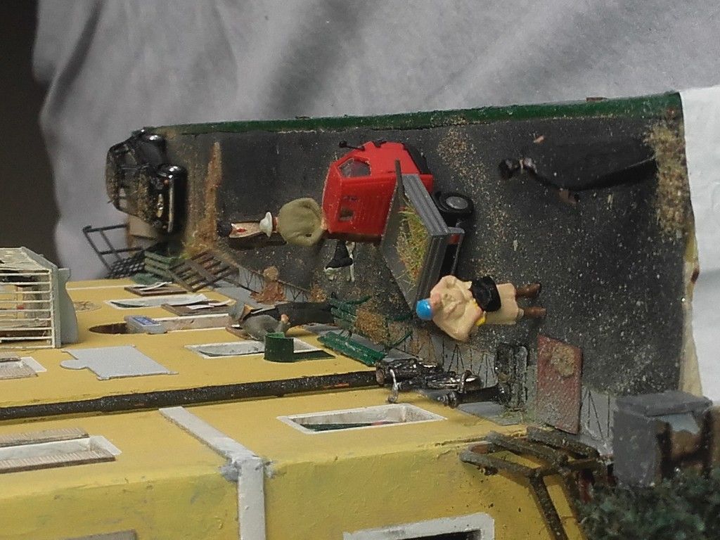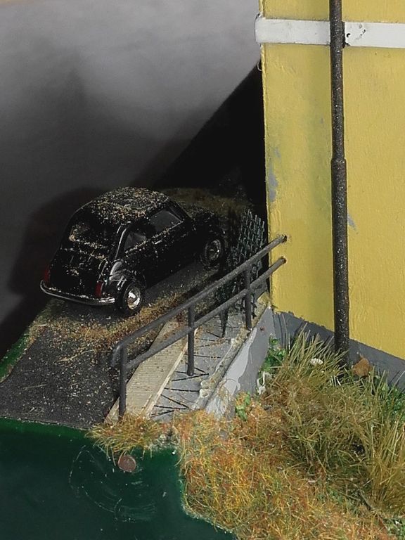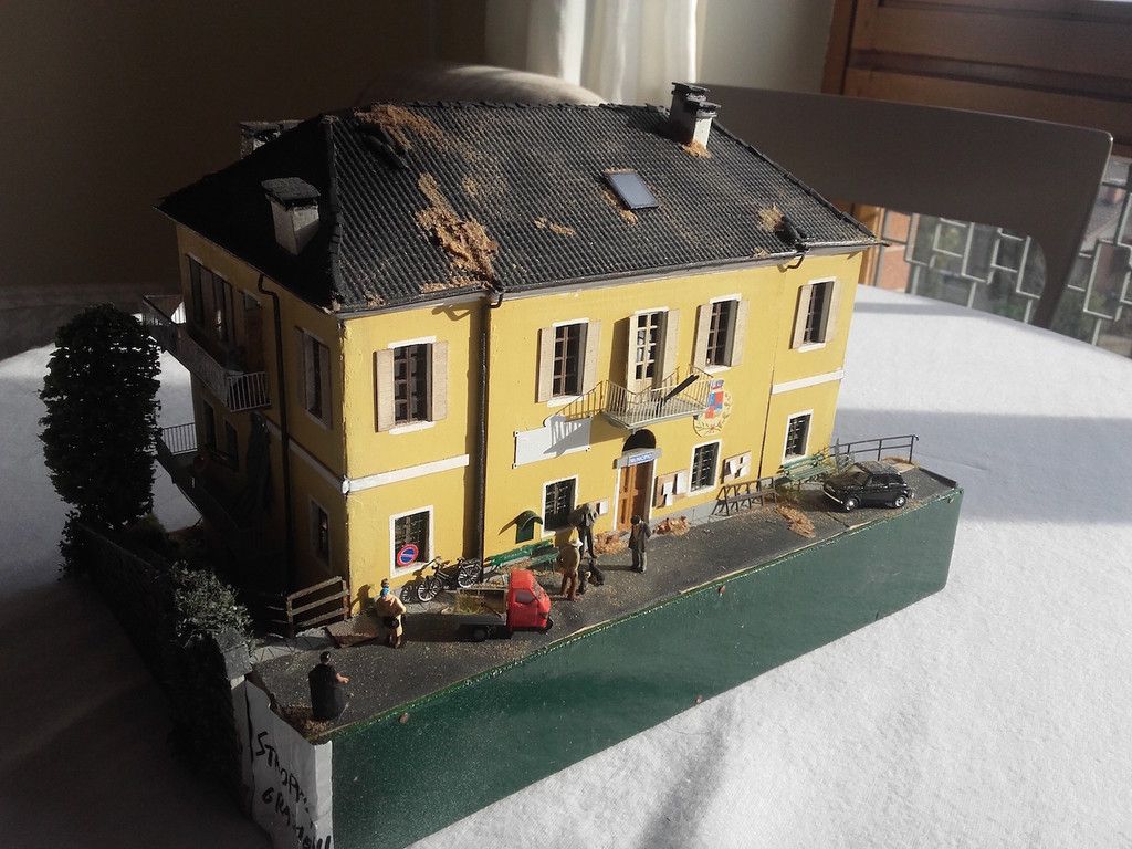 Il modello del municipio di Stroppo è stato immaginato dopo una nottata ventosa d'autunno di inizio anni '80. Ci sono persone al lavoro per riparare i danni provocati dal vento e sono state ricreate alcune scene di vita.